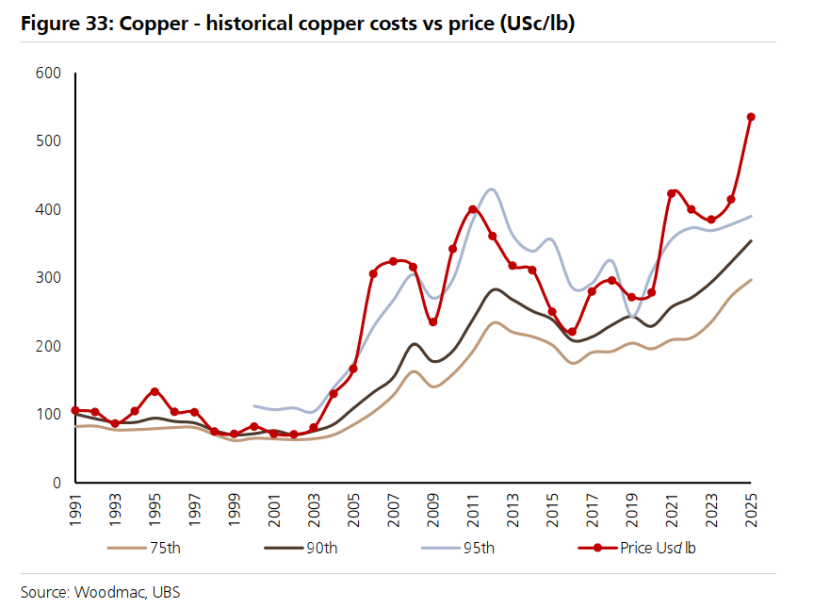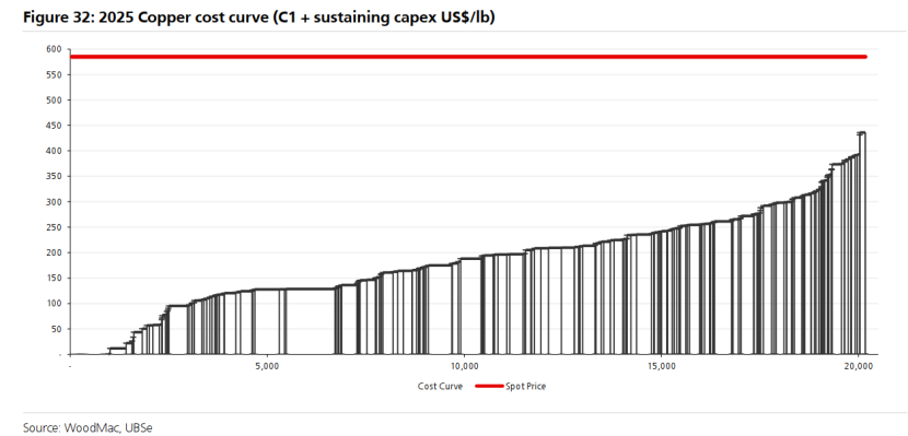 截至2025年,伍德麦肯兹估计成本曲线(C1+维持性资本支出)的第90百分位约为3.00美元/磅,第95百分位约为3.50美元/磅。我们认为,铜矿商持续低估了“真实的维持性资本支出”,因此现金流盈亏平衡边际成本约为4-4.50美元/磅。
