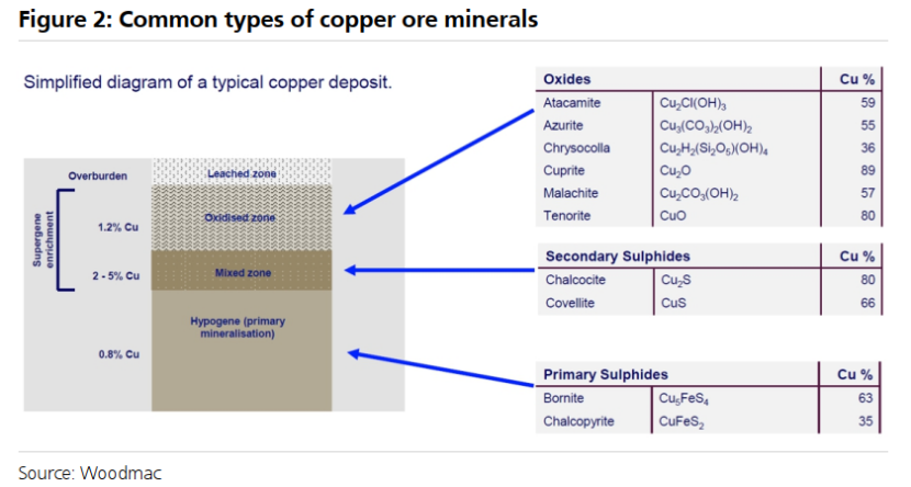 矿石有两大类——硫化矿和氧化矿——它们以不同的方式加工。铜氧化物矿床靠近地表,通常下面有更大的硫化矿床。