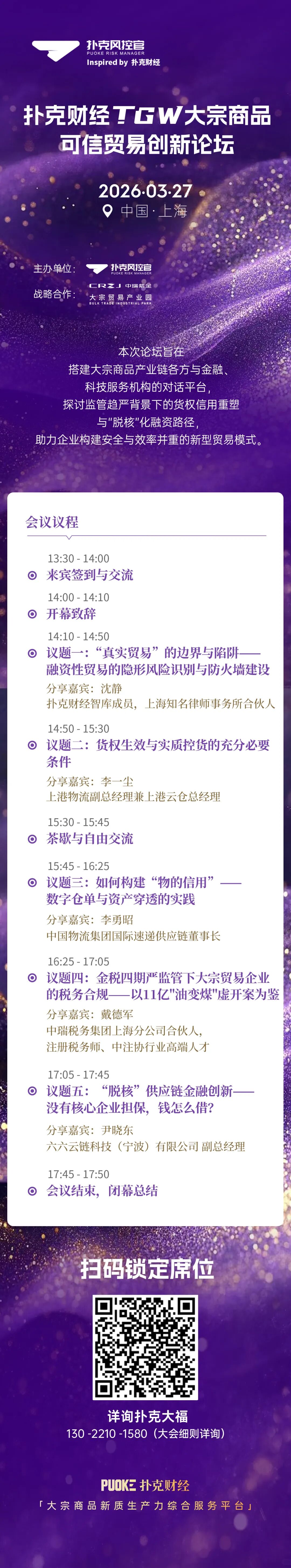 ]article_adlist-->2026年3月27日,由扑克财经旗下扑克风控官主办的「扑克财经TGW大宗商品可信贸易创新论坛」将在上海启幕。本次论坛聚焦行业最迫切的合规与风控痛点,汇聚产业、金融、法律、税务及科技领域的专业力量,为企业在新时代重构风控逻辑、夯实交易信用提供可落地的路径指引。会议价值