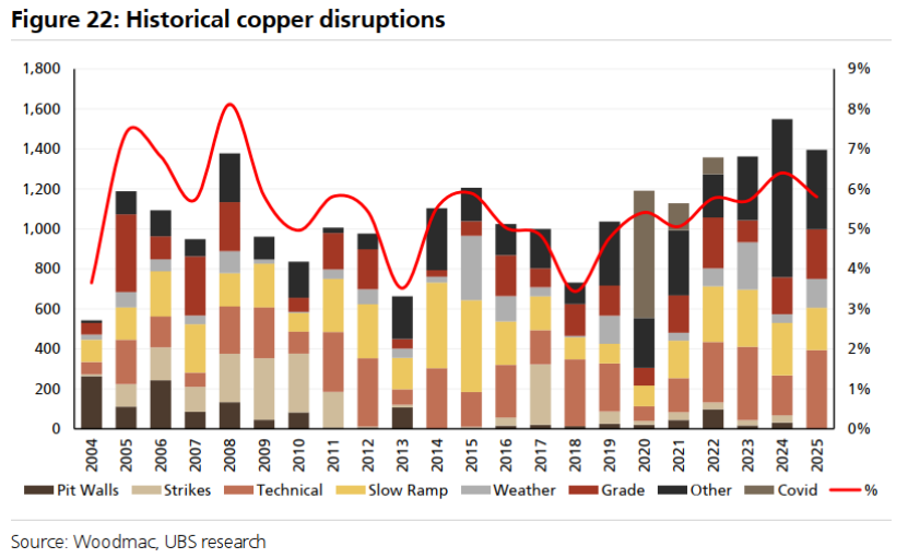 2024年中断率很高,2025年仍保持高位,>5%,并且包括主要矿山(格拉斯伯格、卡莫阿-卡库拉、埃尔特尼恩特)的重大问题,这也导致2026/27年矿山供应预测大幅下调,进一步限制了本已有限的新项目和矿山供应增长。