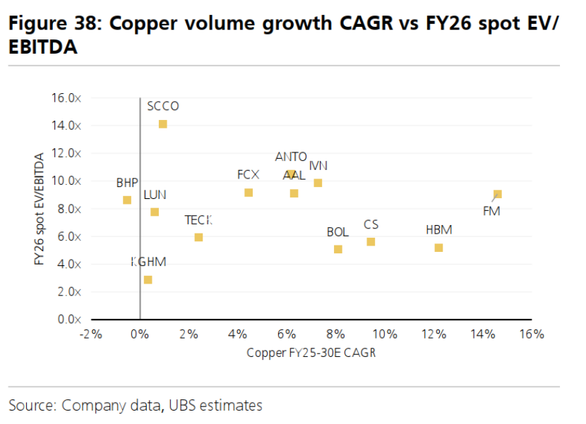 图38:铜产量复合年增长率 vs FY26现货企业价值/息税折旧摊销前利润