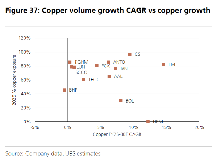 ·英美资源:在2025年生产了约71.5万吨铜(应占产量约48万吨),主要来自其持股44%的科亚瓦西、持股50%的洛斯布朗塞斯和持股60%的奎拉维科铜矿。该公司拥有多项中期低资本密度的有机增长选项,包括科亚瓦西脱瓶颈/洛斯布朗塞斯-安迪纳合资项目。在与2025年生产了约44万吨铜(应占产量约30万吨)的泰克资源(买入评级)完成待定的合并后,英美资源-泰克将成为第二大上市纯铜业公司,产量约120万吨,预计到2030年增长至约150万吨。