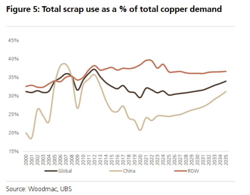 图5:总废料使用量占总铜需求的百分比
