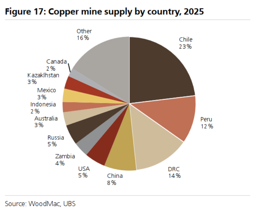 2025年全球矿山铜产量约为2300万吨,生产相对分散,前10大生产商供应了约37%的总市场。智利(23%)、秘鲁(12%)、刚果(金)(14%)、中国(8%)和美国(5%)是最大的铜矿生产国。