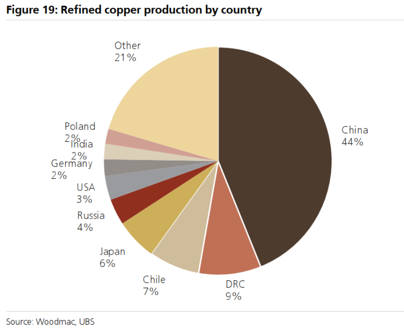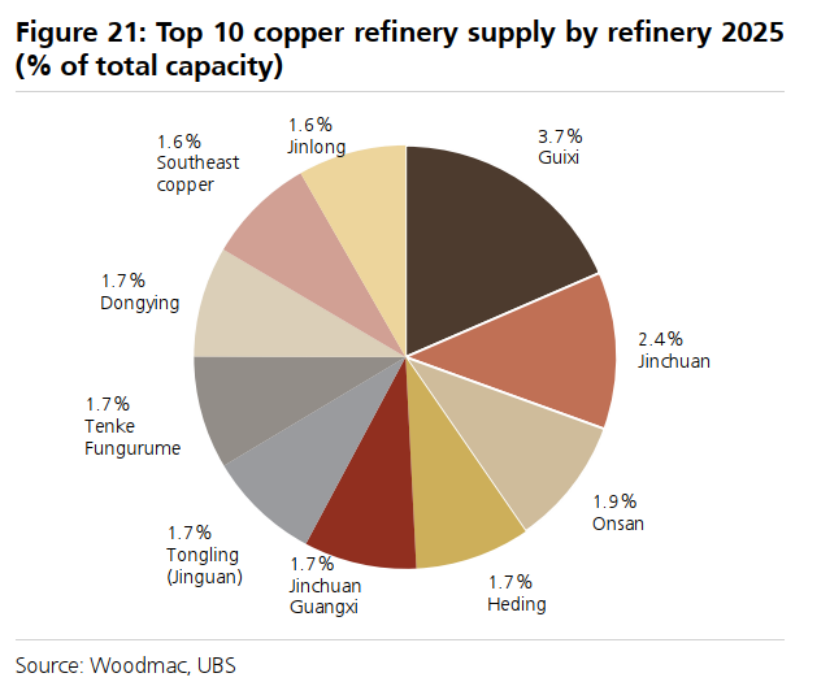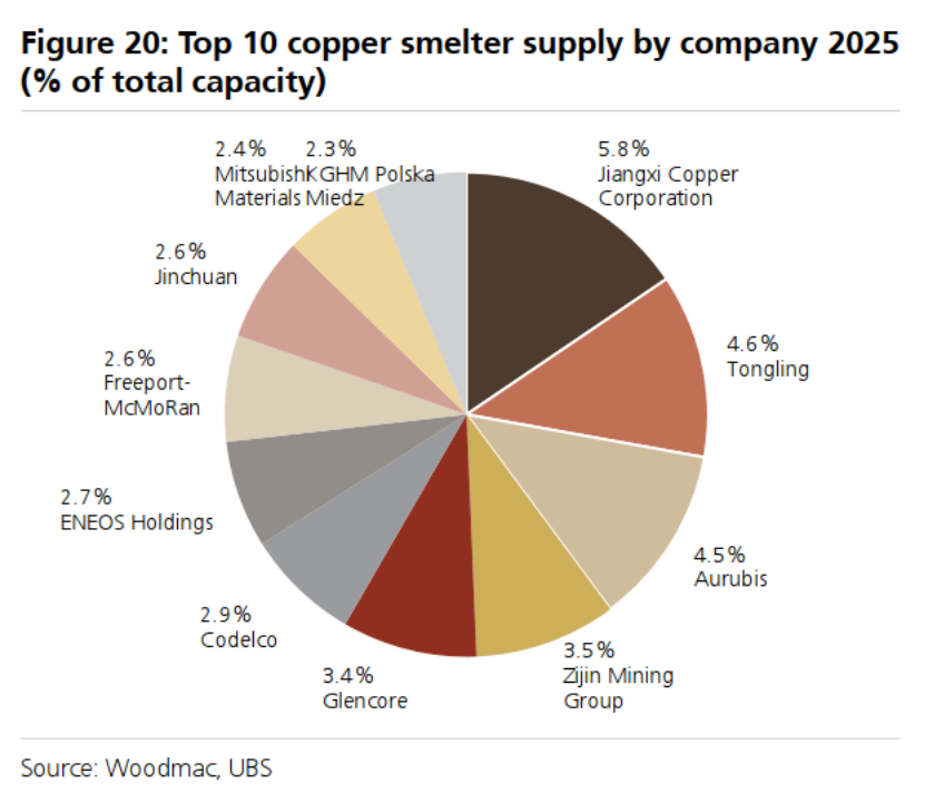 主要的铜矿生产国是智利(23%)、秘鲁(12%)、刚果(金)(14%)、中国(8%)和美国(6%)。2025年全球最大的铜业公司(按权益计)包括智利国家铜业公司(Codelco)、必和必拓(BHP)和自由港麦克莫兰(Freeport)(分别约占6%、6%和4%)。与其他金属一致,中国在铜熔炼和精炼领域占据主导地位,关键的贸易流是从拉丁美洲(智利和秘鲁)出口铜精矿到中国进行熔炼/精炼。